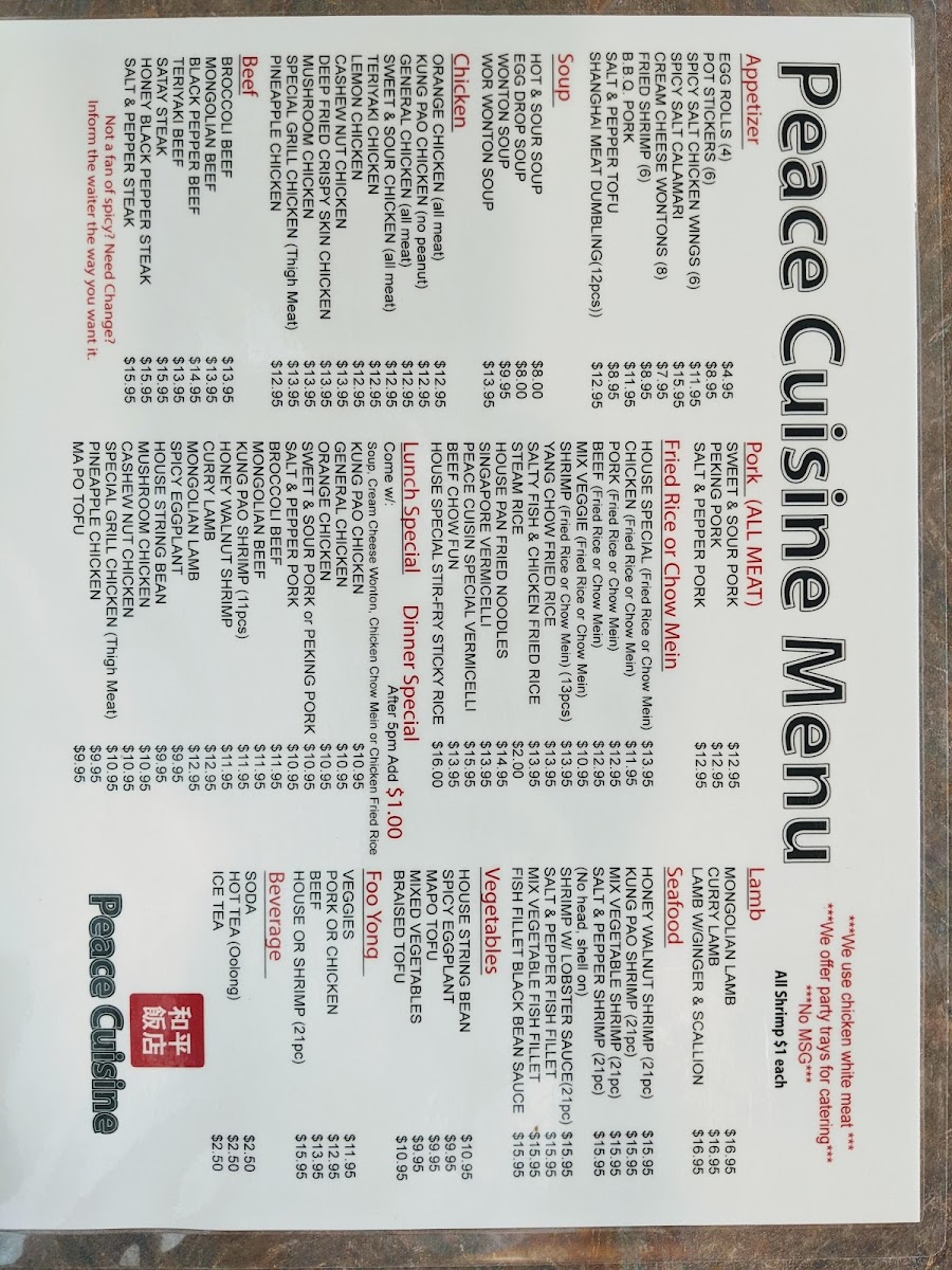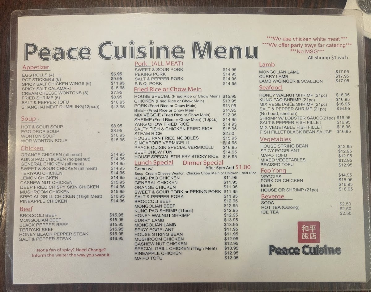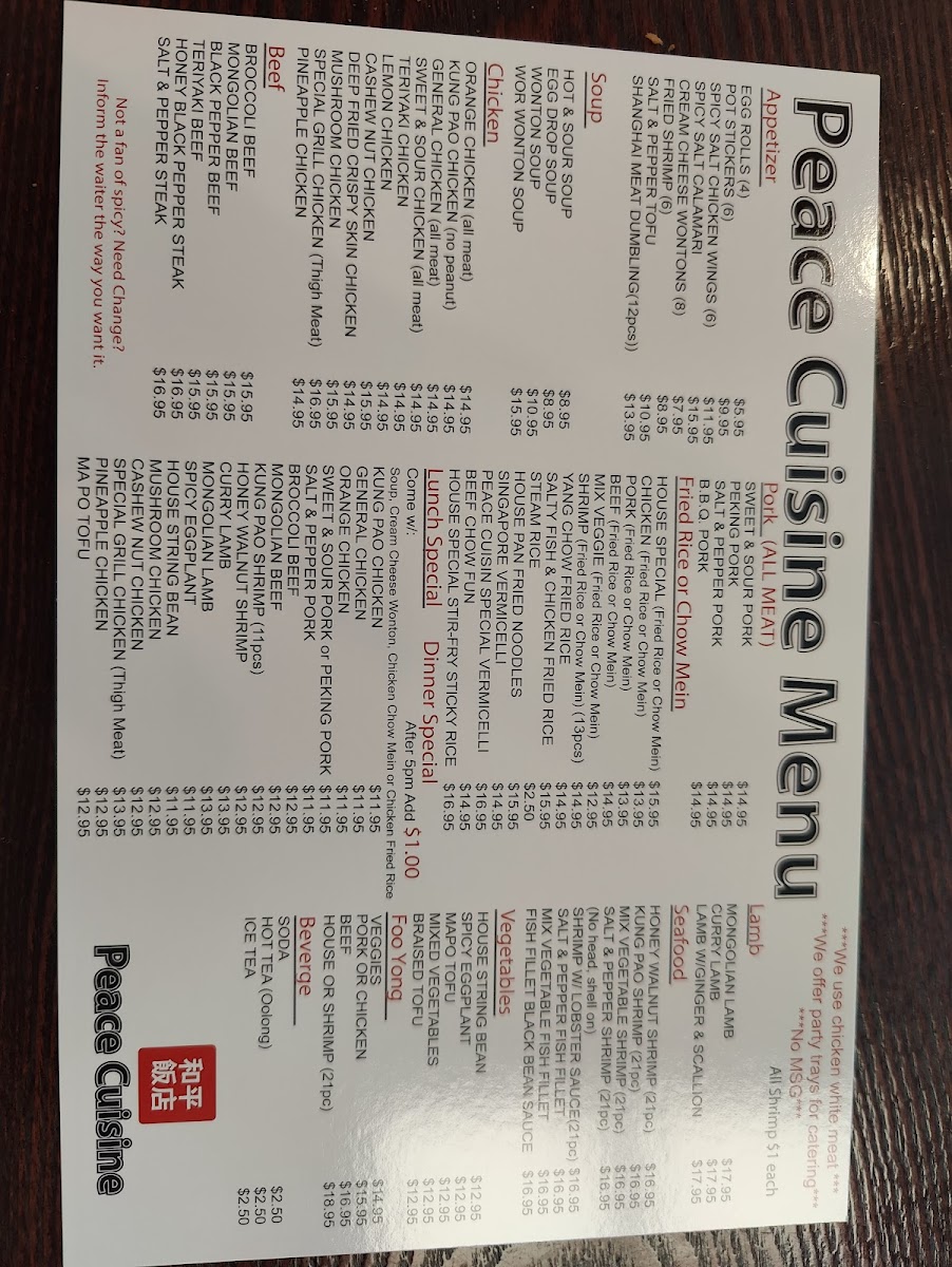 The menu at Peace Cuisine boasts a variety of authentic dishes that cater to every palate. If you’re a fan of lamb, you can indulge in their Mongolian Lamb or Curry Lamb, both priced at a comforting $12.95. But the culinary journey doesn’t stop there—dive into the delightful realm of fried rice with selections like House Special Fried Rice, a hearty meal for just $11.95, or treat yourself to the scrumptious Yang Chow Fried Rice at the same price. Those craving sustenance beyond rice can enjoy the appealing Broccoli Beef or Mongolian Beef dishes for $11.95, perfectly marrying vibrant vegetables with tender beef.