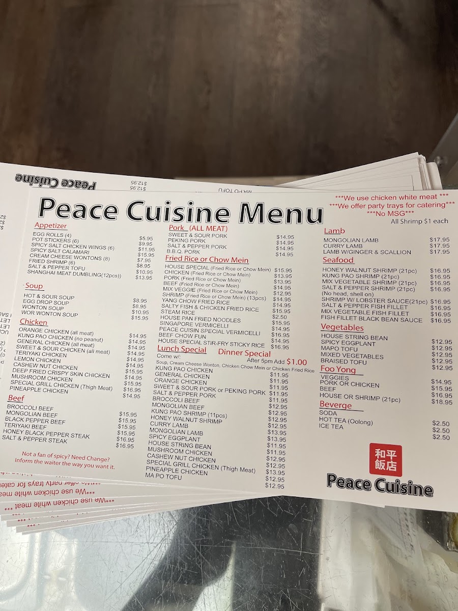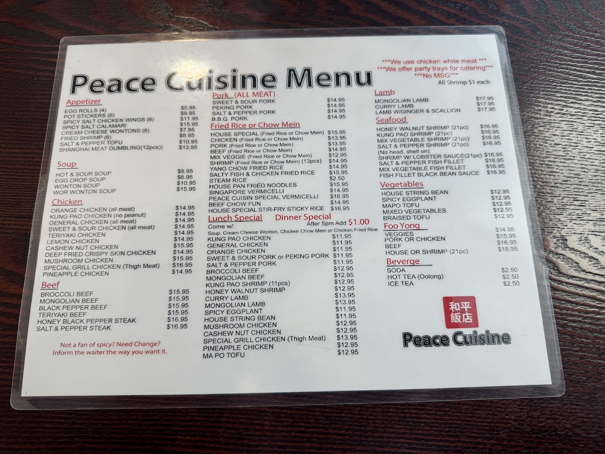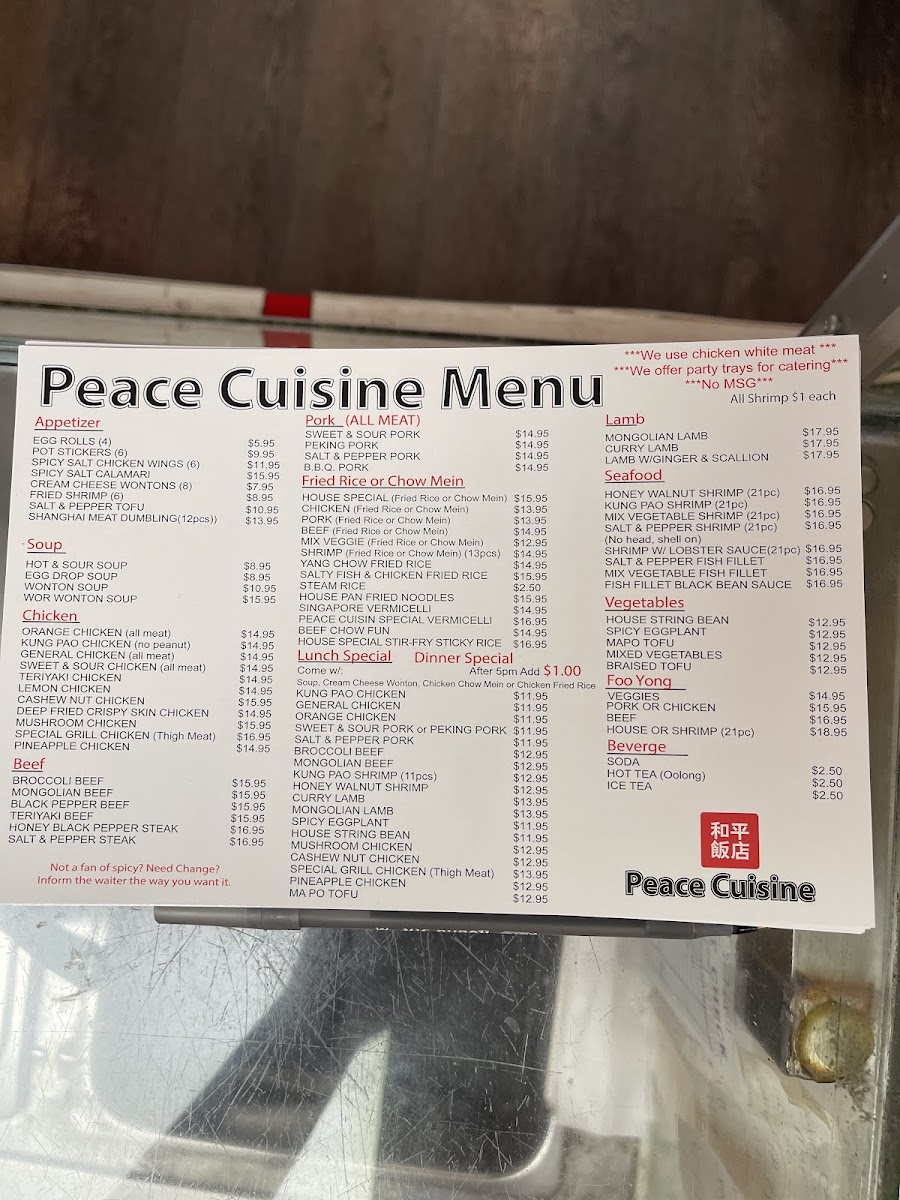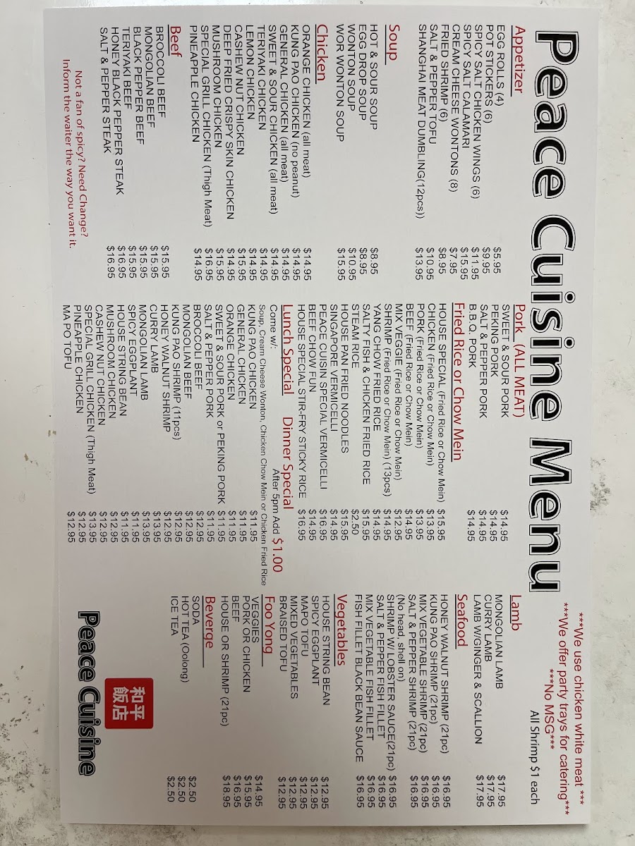 As you step inside, you’ll notice the enticing aroma wafting from the kitchen, where the sounds of the wok fill the air—it's a place that prides itself on efficiency and quality. Whether you’re looking to enjoy a casual meal with friends or seeking a late-night comfort food fix, Peace Cuisine provides the perfect setting for any occasion. Guest reviewers highlight the Wor Wonton Soup as a must-try, promising a medley of textures and flavors that warms the heart.